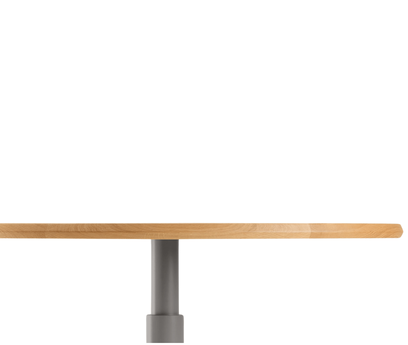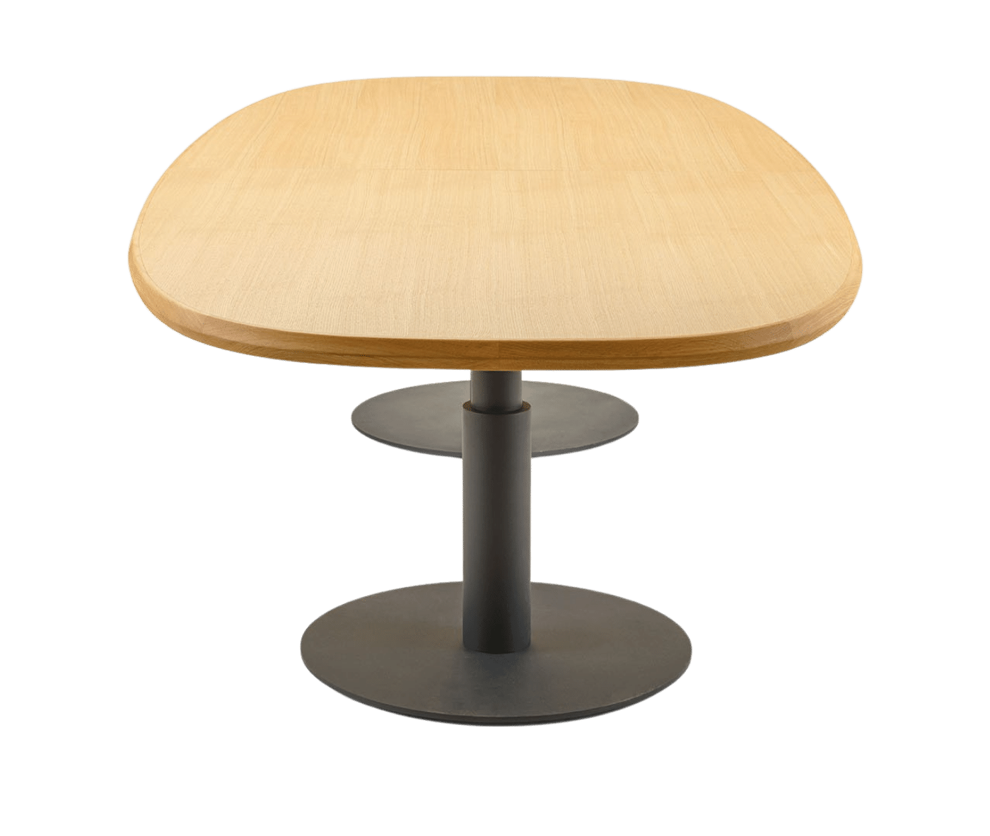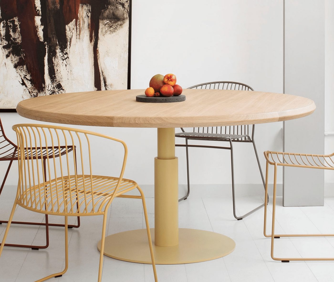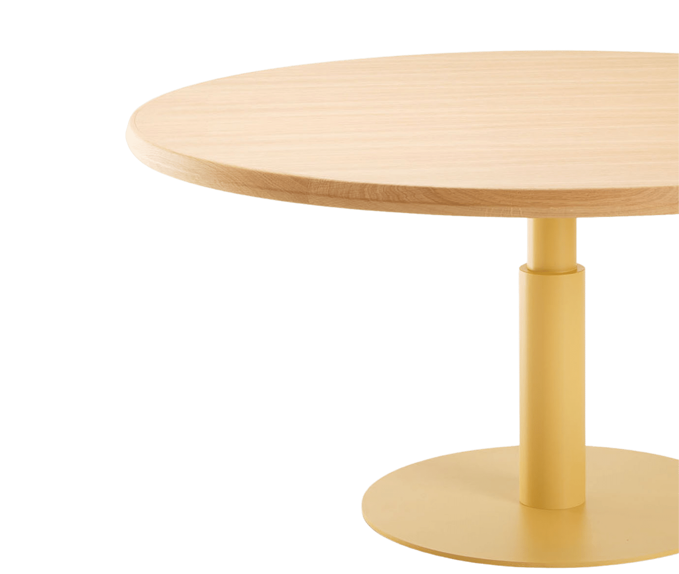 The tabletop features beech plywood with solid wood edging, while the sturdy base consists of a central concentric steel column, available in a variety of colours. The table’s unique design centres on the top profile, making the edge a focal point of both style and functionality. Its technical composition — including the solid wood frame, beech plywood core, and concentric steel base — embodies a harmonious blend of functionality and sophistication.
