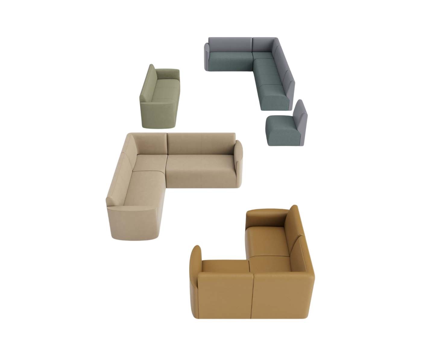 Available as single pieces or modular configurations, the inclusion of a corner element enhances flexibility and allows for a wide range of compositions. Choose between single-colour upholstery for a timeless look or two-tone options to introduce a touch of vibrancy.