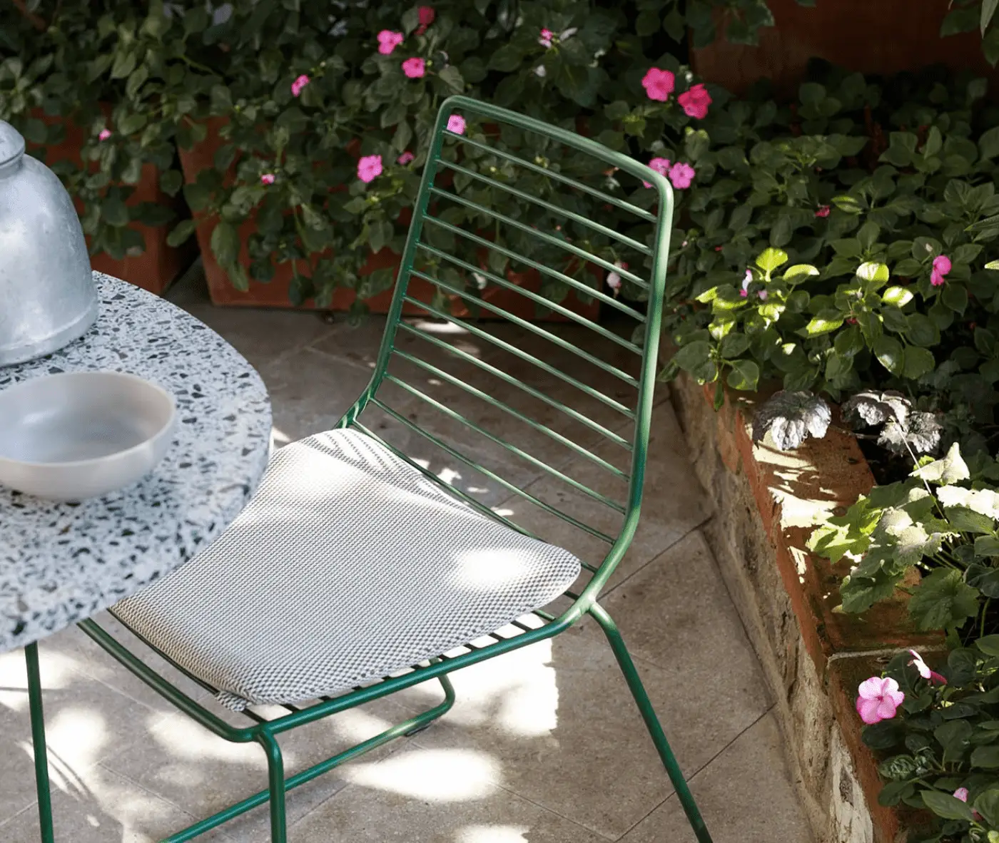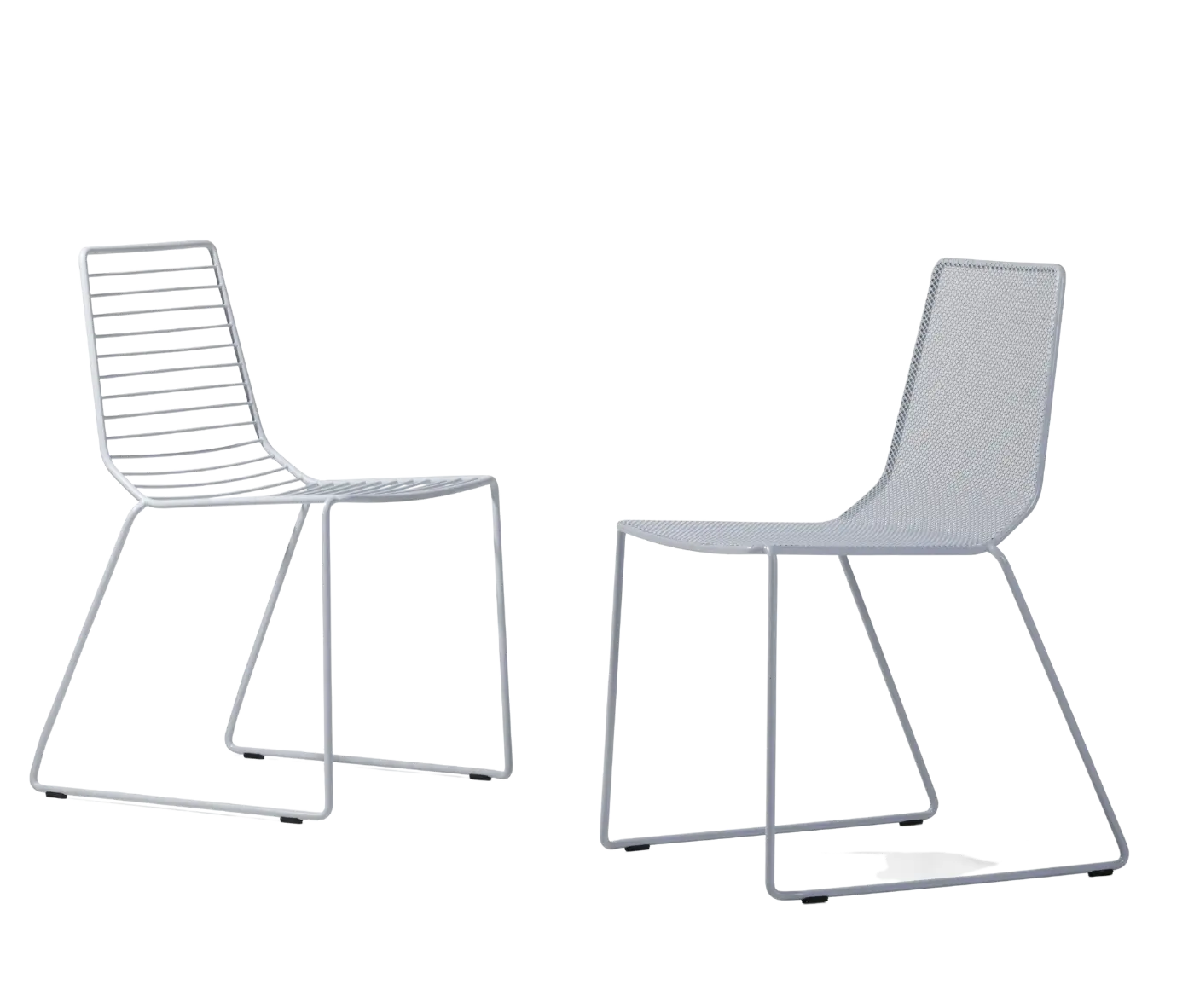 A new chair that takes up the light and contemporary line of the indoor collection, but now defined by a steel structure in two different versions, with wire mesh or rods.