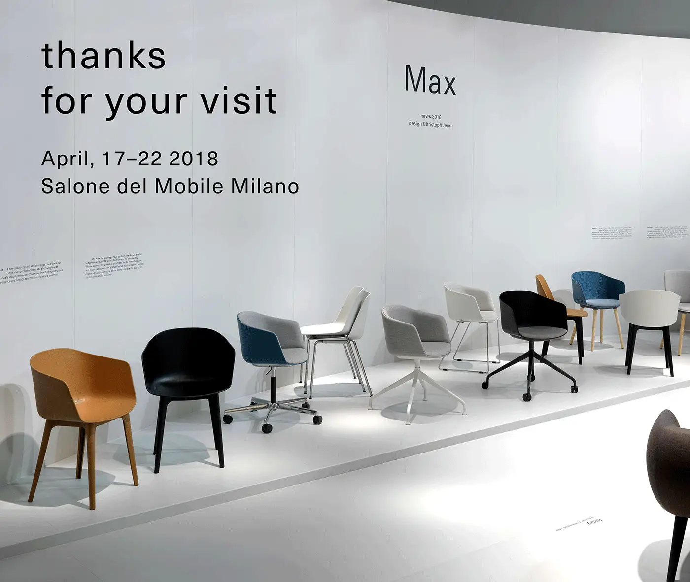 Designer Christoph Jenni describes the Max collection as “a sort of mix and match attitude takes place in the association of components, materials and products themselves. It is an open and adaptive program driven by the search for comfort, versatility and sustainability. We look at our collection in relation to the multitude of contexts and possible combinations hidden behind needs and projects. There is a whole new concept behind this product development. All the different frames have been thought and designed to fit both products, chair and armchair. A “one fits all” approach in line with the crucial values of functionality and flexibility. Moreover, recycled organic polypropylene and eco–friendly recycled wood have been added to our collection. These new additions are used for bases as well as shells. The result is a monolith object made from the same reclaimed material, a well–proportioned chair where the structure is hidden in the form itself.”