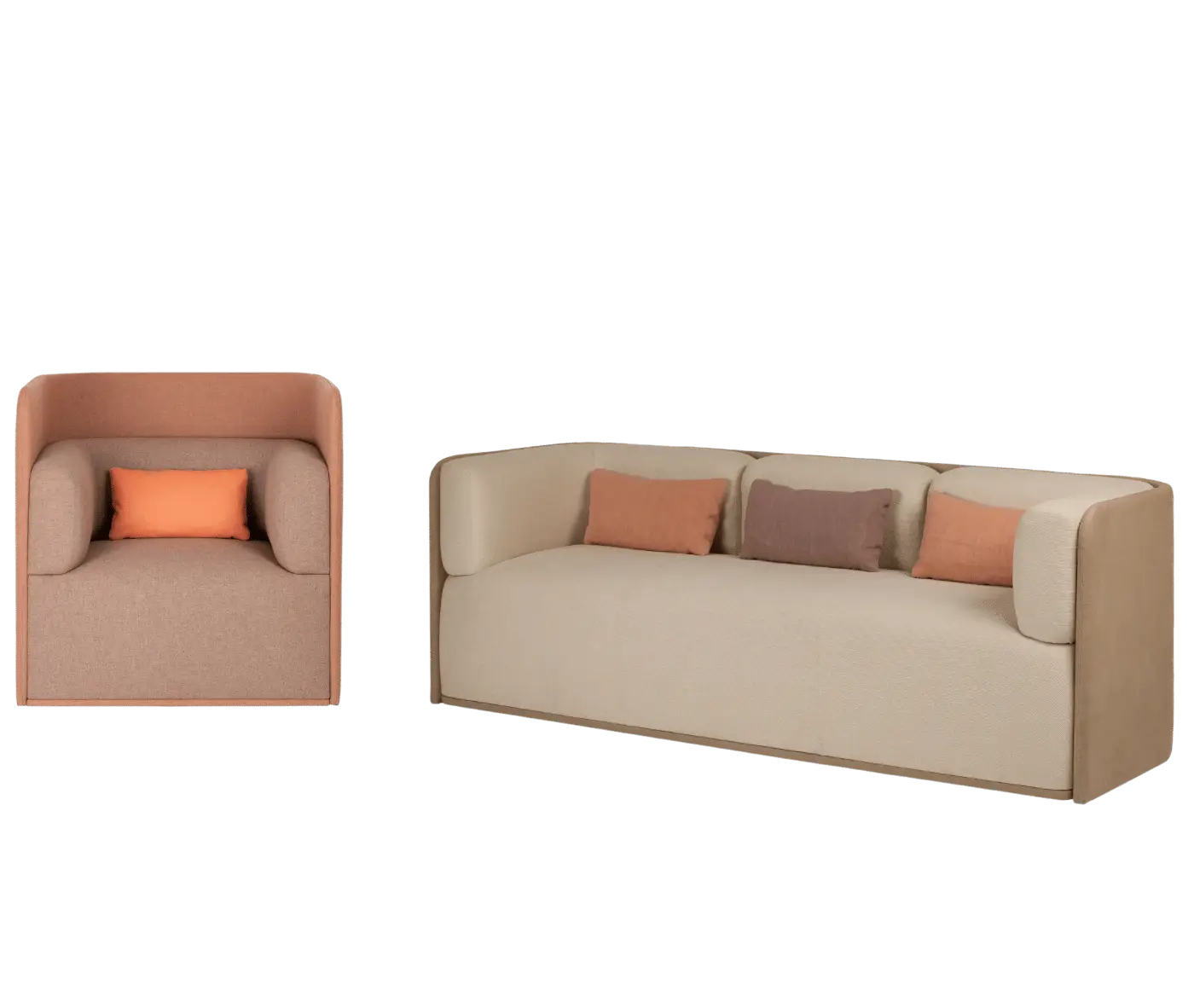 The system includes the armchair, 2-seater and 3-seater sofa, all available in two versions with low backrest (for living and lounges) or high backrest for better privacy in professional workspaces.