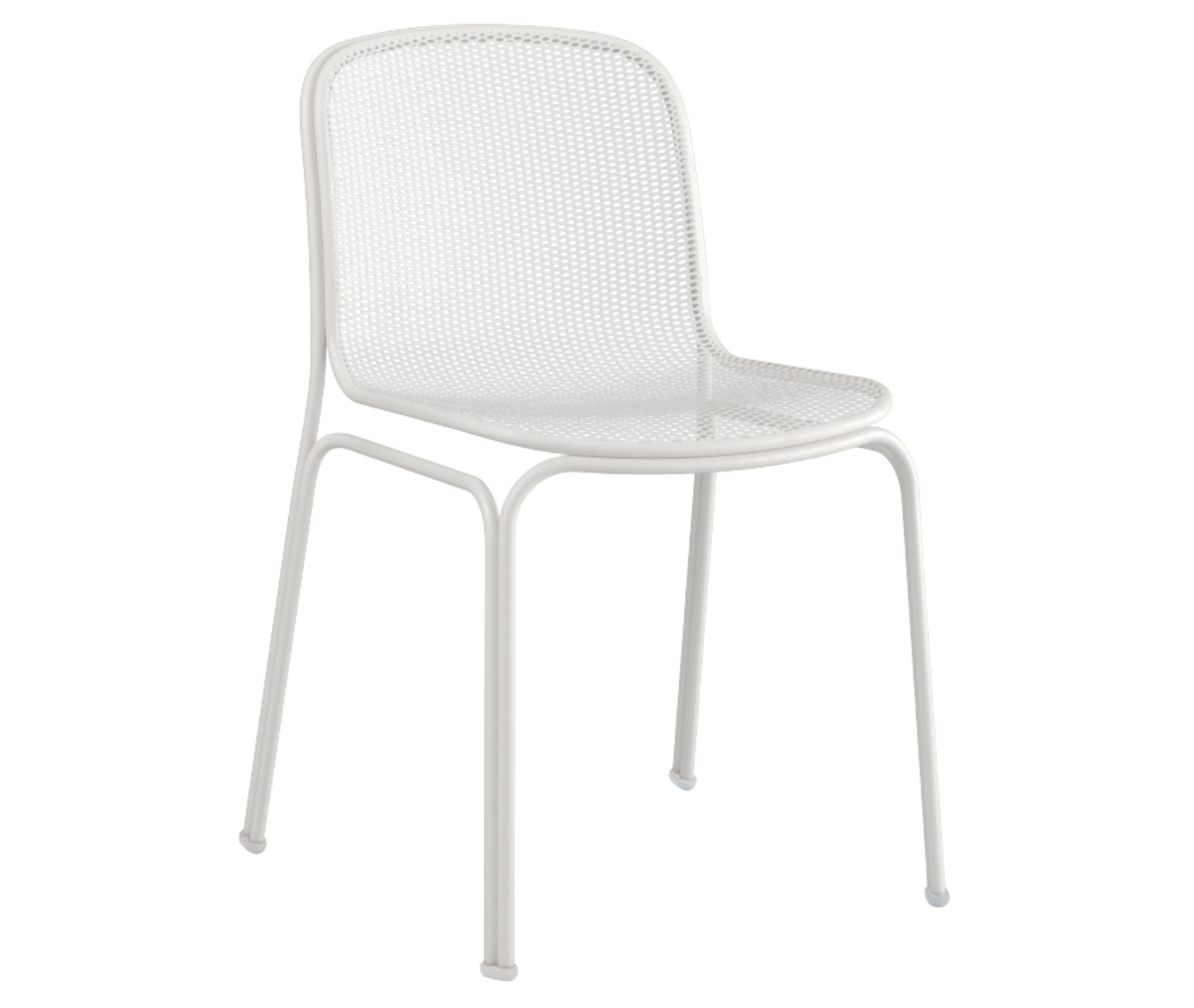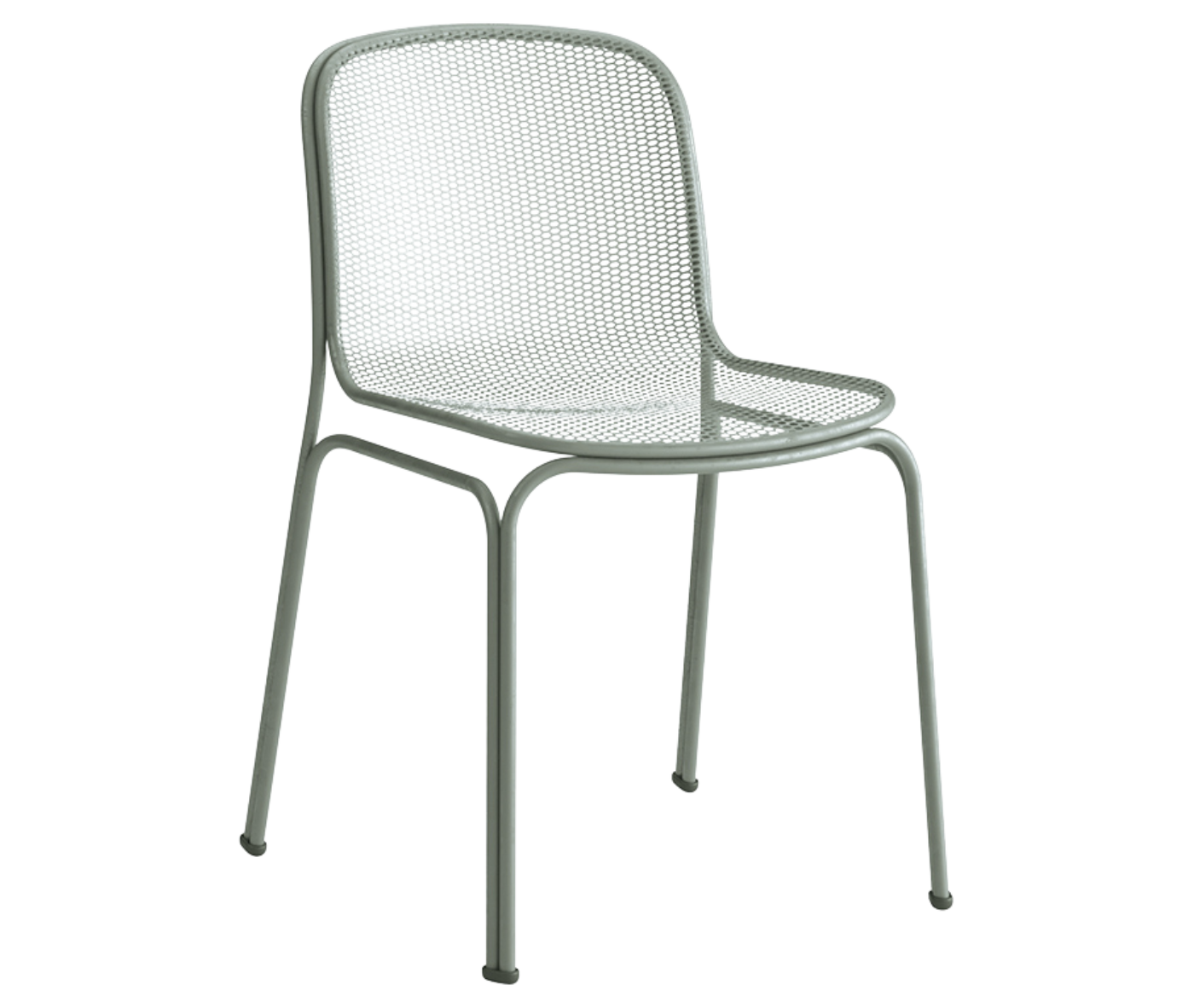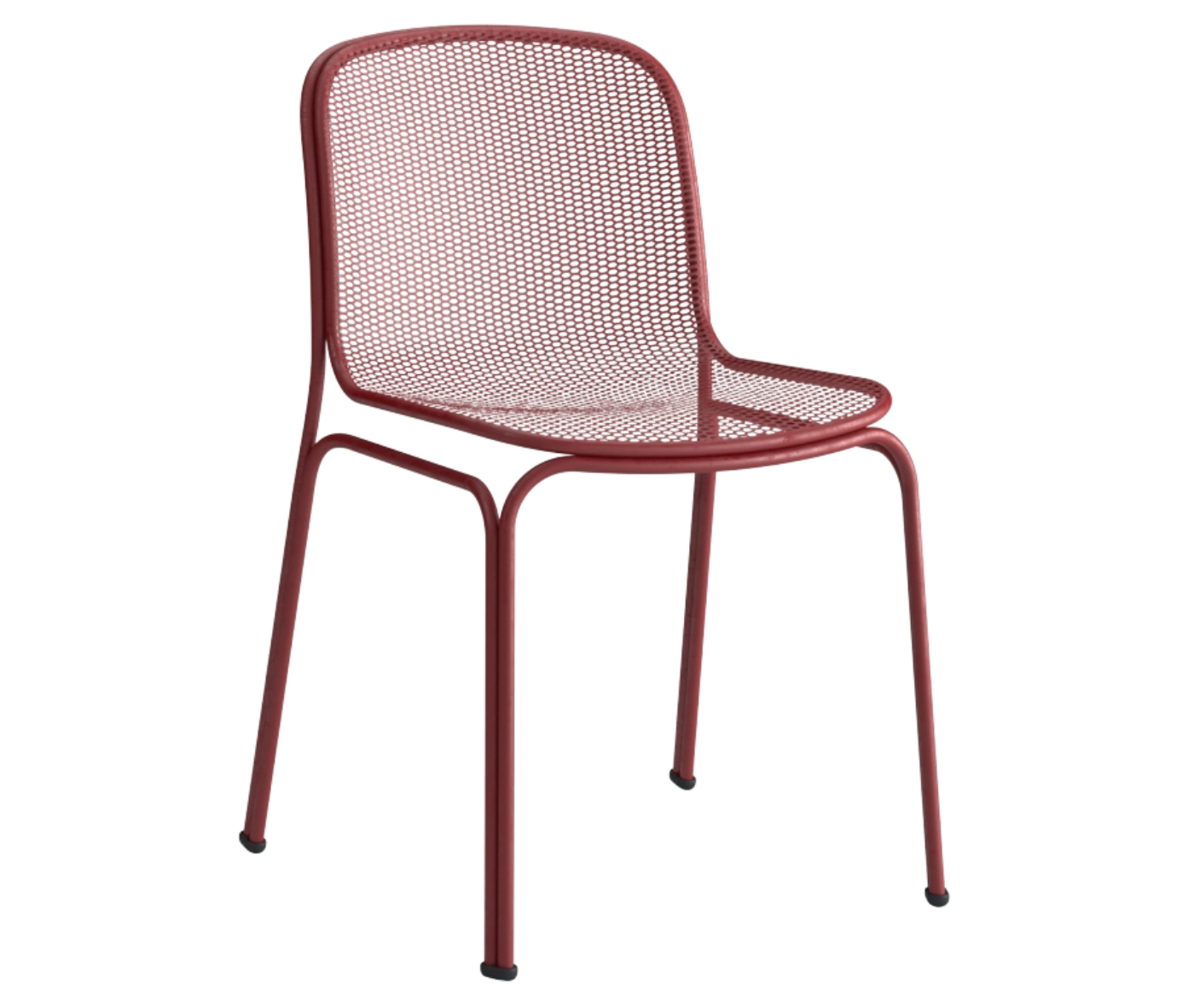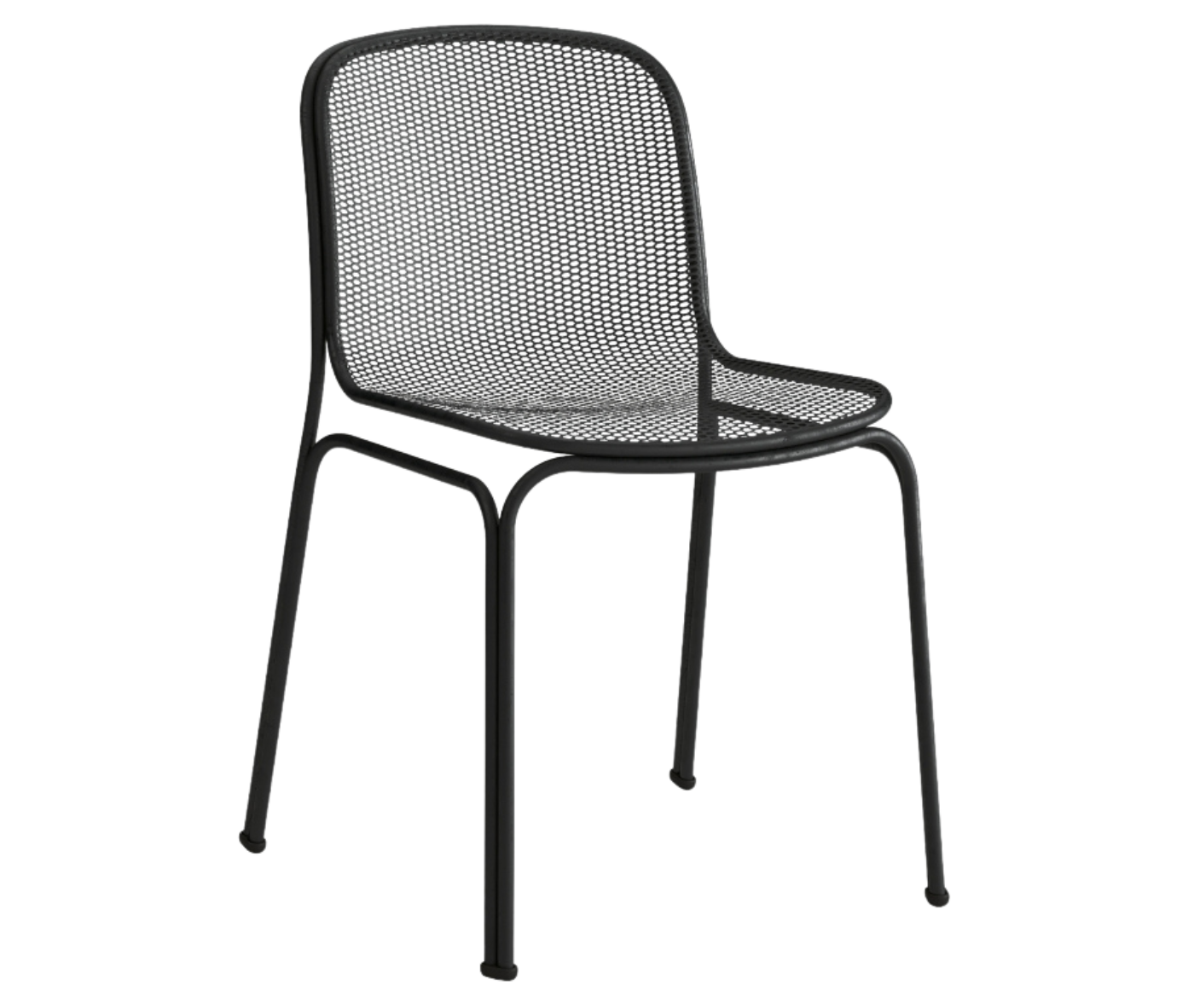 Villa is an entirely metal chair featuring a steel rod frame and a steel net stretched mesh shell.