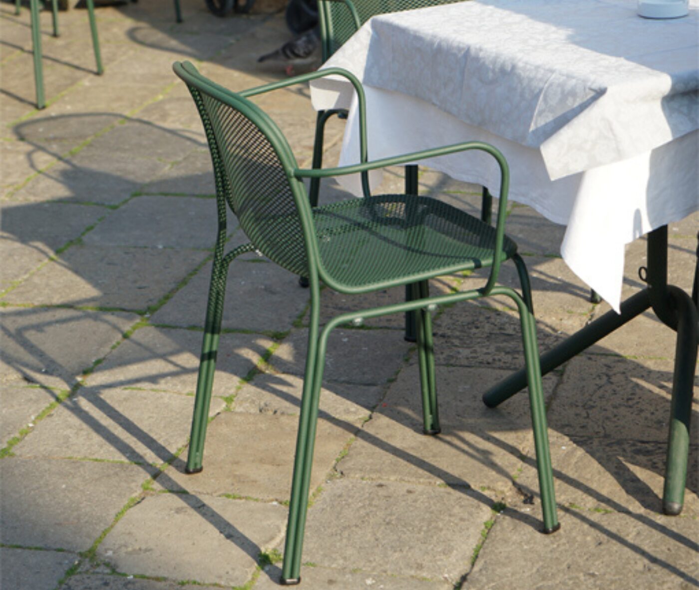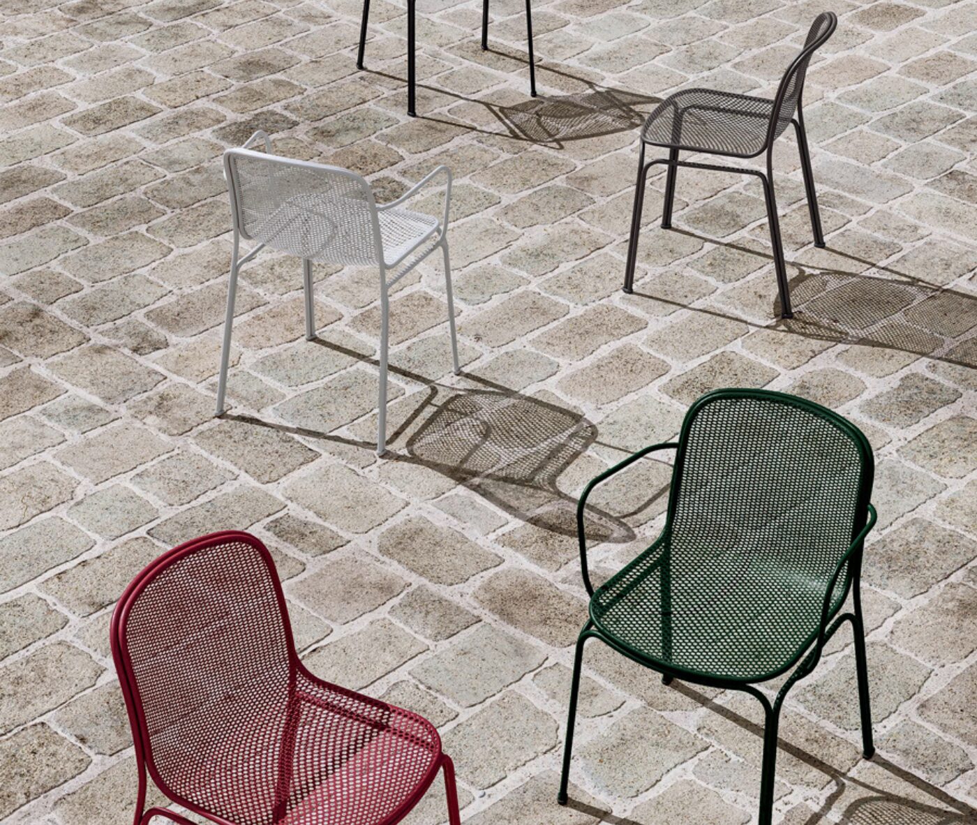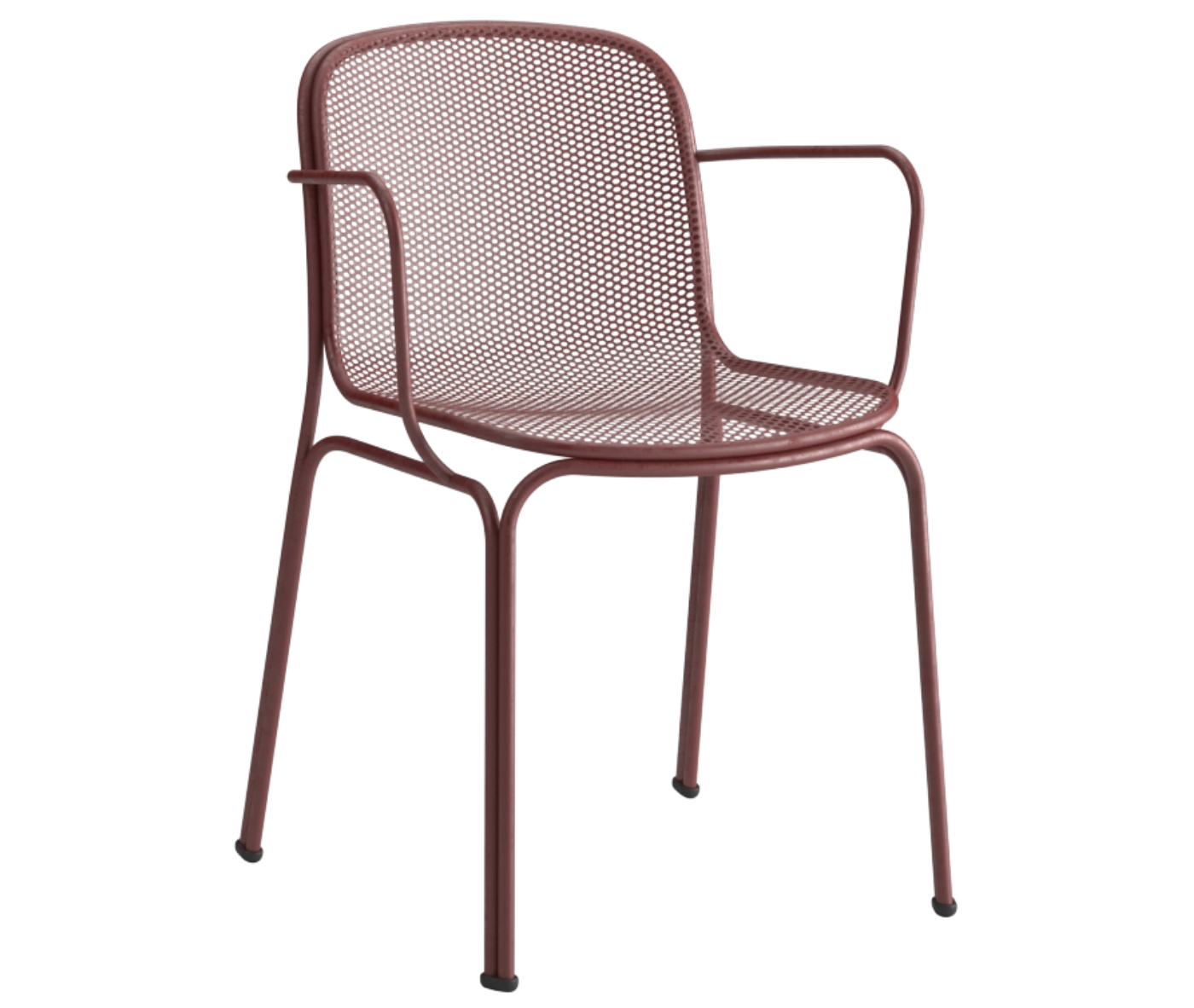 Villa 2 is an entirely metal chair featuring a steel rod frame with arms and a steel net stretched mesh shell.