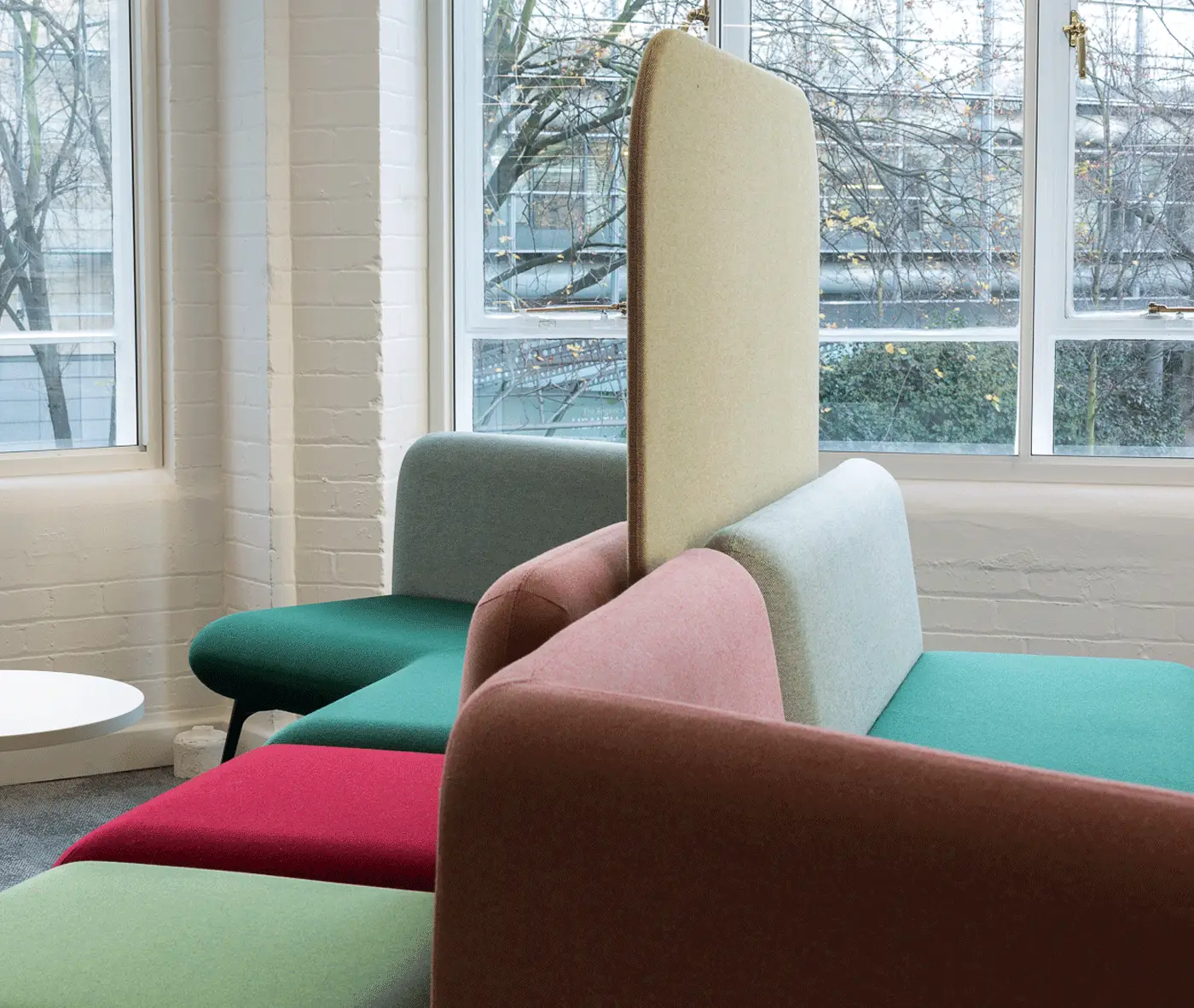 Several Myriad seating units in bright colourways, standing out against the workspace’s white walls, were chosen for the breakout areas. Agent high tables and the Agent benches were chosen for a separate breakout area closer to the upstairs kitchenette.